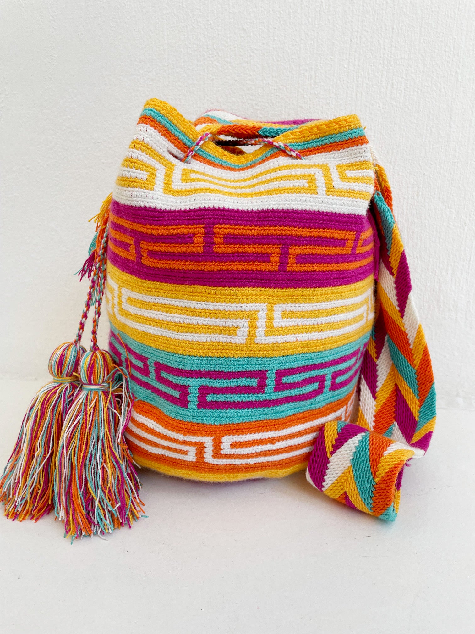 One of a kind mochila bag. Each one is unique and 100% hand made in Colombia. Dimensions (remember each one is hand-made by different artisans) Height: 28-30 cm (+-2cm) Base diameter: 18-23 cm (+-2cm) Strap: Long: 105 cm (+-5 cm) Width: 5.5 cm (+-0,5 cm)