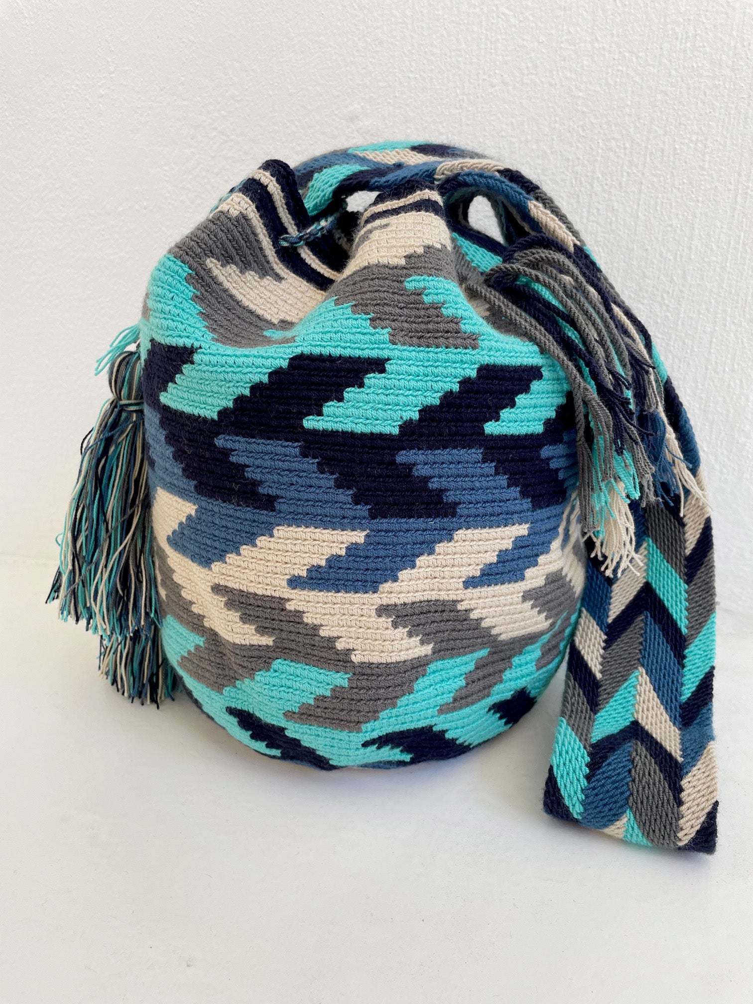 One of a kind mochila bag. Each one is unique and 100% hand made in Colombia. Dimensions (remember each one is hand-made by different artisans) Height: 28-30 cm (+-2cm) Base diameter: 18-23 cm (+-2cm) Strap: Long: 105 cm (+-5 cm) Width: 5.5 cm (+-0,5 cm)