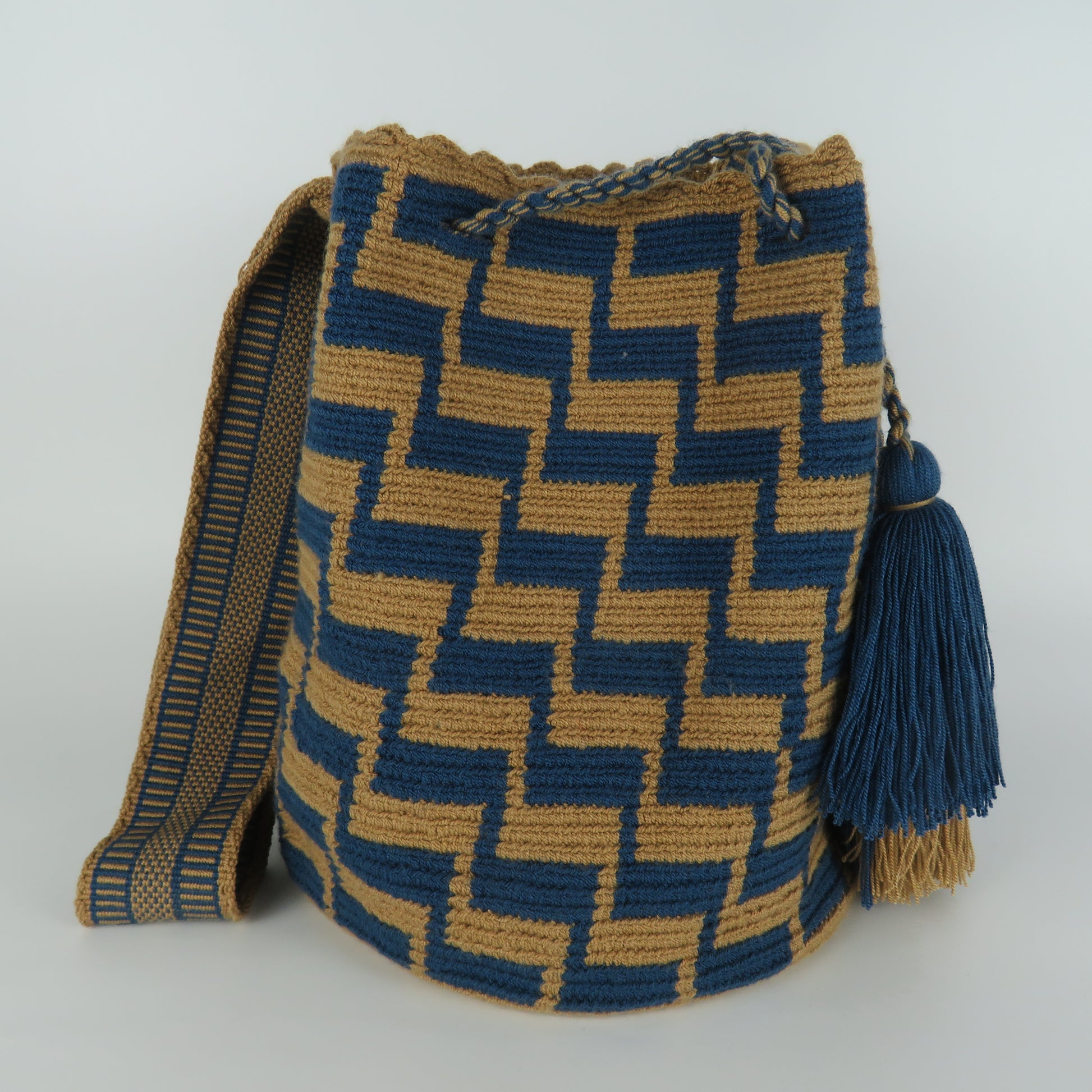 One of a kind mochila bag. Each one is unique and 100% hand made in Colombia. Dimensions (remember each one is hand-made by different artisans) Height: 28-30 cm (+-2cm) Base diameter: 18-23 cm (+-2cm) Strap: Long: 105 cm (+-5 cm) Width: 5.5 cm (+-0,5 cm)